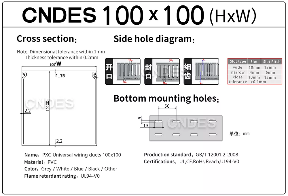 Optimieren Sie Ihre Verkabelungsprojekte mit unseren maßgeschneiderten 100×100-Drahtmanagement-Kabelkanälen. Als führender Hersteller und Lieferant von PVC-Kabelrinnen in China bietet CNDES zuverlässige, hochpräzise und anpassbare Lösungen für alle Ihre Kabelmanagementanforderungen. Wir haben alle Spezifikationen für Kabelkanäle (Kabelrinnen). Wenn Sie andere Spezifikationen benötigen, können Sie uns gerne kontaktieren!