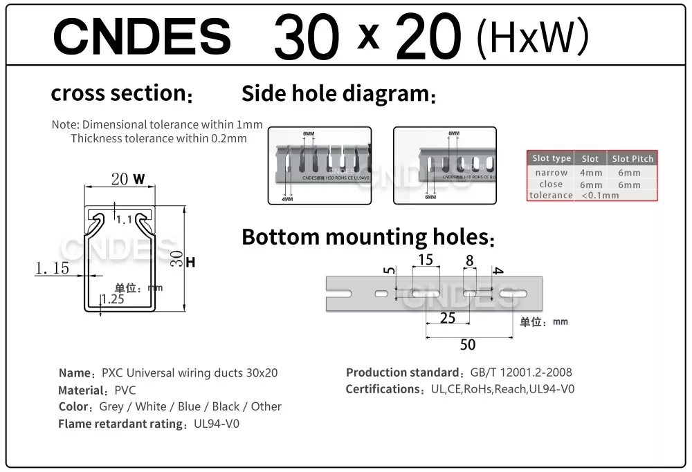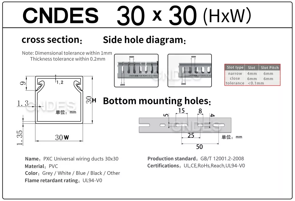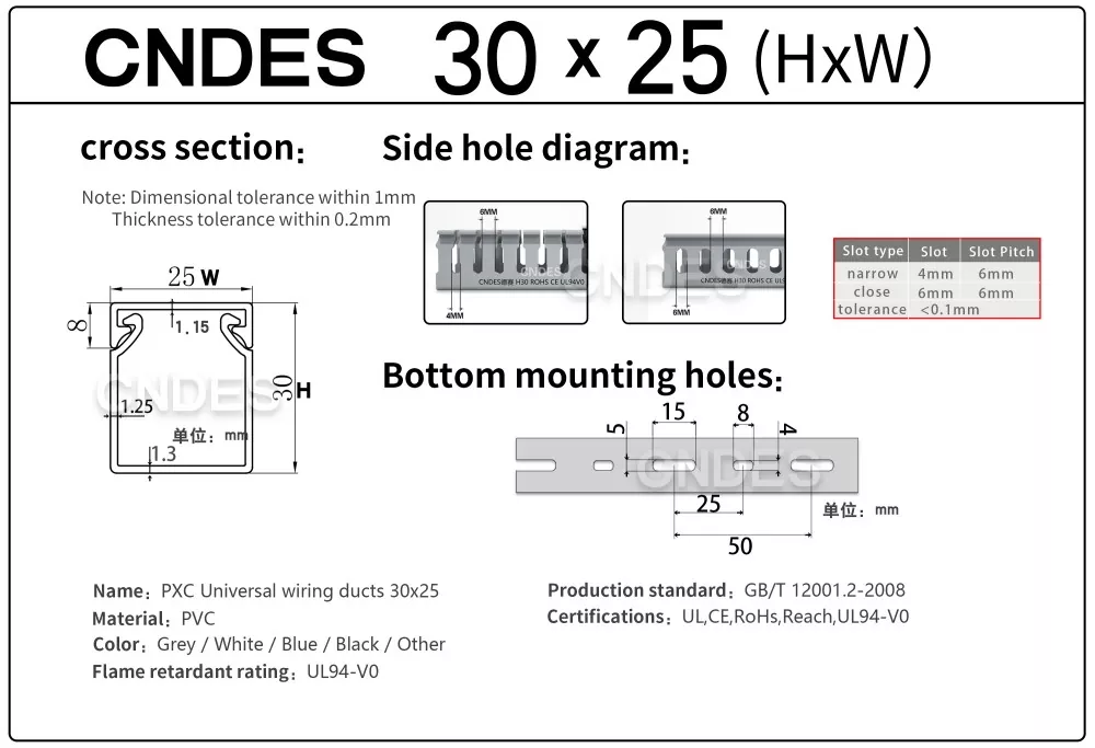 Es enthält Informationen wie die Dicke, Abmessungen und Bohrungen unseres hochwertigen 30 mm hohen, geschlitzten PVC-Kabelführungskanals.