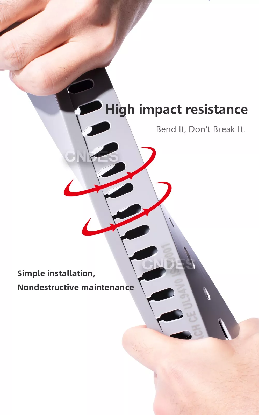 Der Kabelkanal für Schaltschränke von CNDES besteht aus einer proprietären PVC-Formel. Der geschlitzte PVC-Schaltschrankkanal ist umweltfreundlich, flammhemmend und stoßfest und hält wiederholtem Biegen um 180° stand, ohne zu brechen.