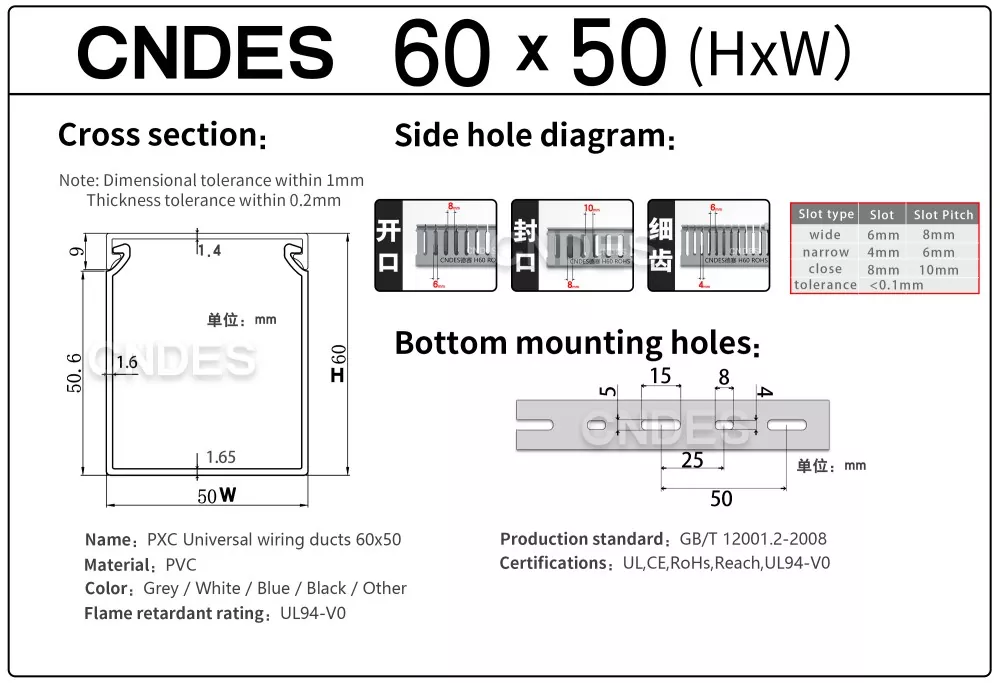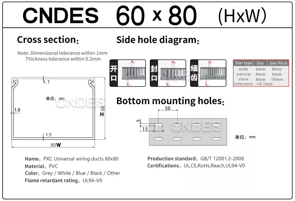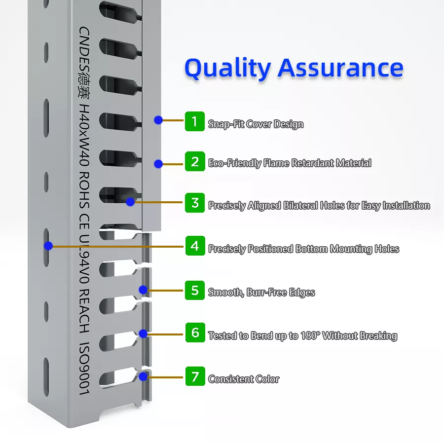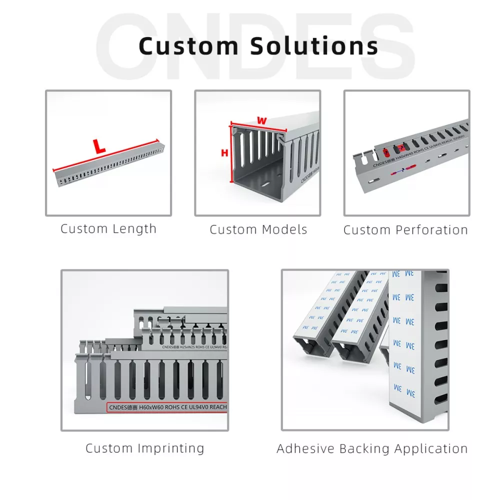 Bei CNDES bieten wir umfassende kundenspezifische Anpassungen für Verkabelungskanäle an. Unsere Dienstleistungen reichen von speziellen Funktionsmerkmalen (antistatisch, UV-beständig, leicht zu brechen) und vollständigen Dimensionsanpassungen (Länge, Höhe, Breite, Lochposition/Profil/Abstand) bis hin zu ästhetischen Branding-Optionen (kundenspezifische Farben, Logo, Textdruck). Wir bieten auch selbstklebende Rückseiten an.