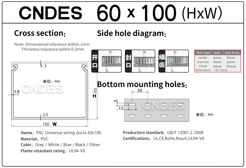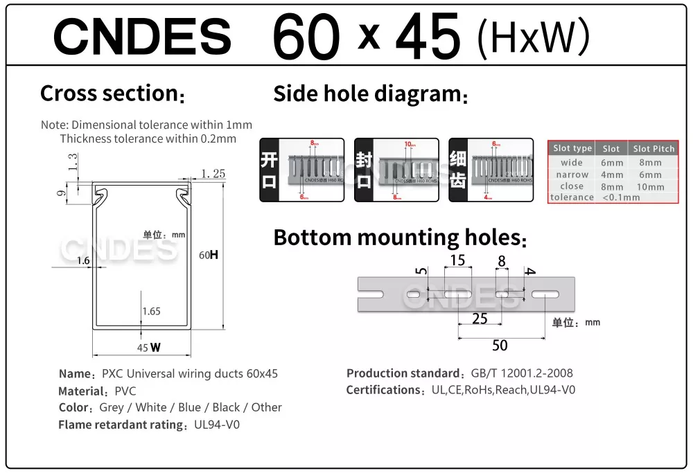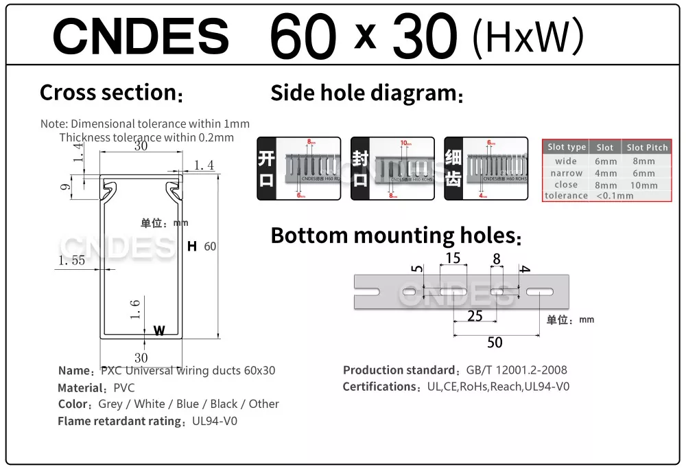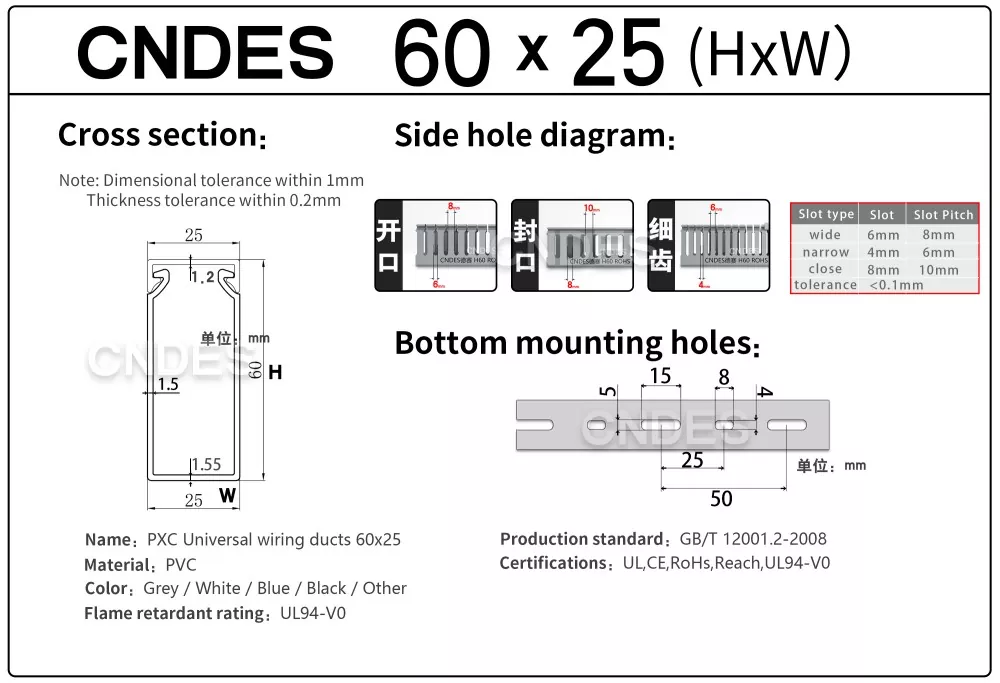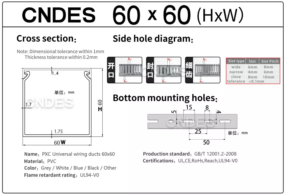 Bei CNDES bieten wir umfassende kundenspezifische Anpassungen für Verkabelungskanäle an. Unsere Dienstleistungen reichen von speziellen Funktionsmerkmalen (antistatisch, UV-beständig, leicht zu brechen) und vollständigen Dimensionsanpassungen (Länge, Höhe, Breite, Lochposition/Profil/Abstand) bis hin zu ästhetischen Branding-Optionen (kundenspezifische Farben, Logo, Textdruck). Wir bieten auch selbstklebende Rückseiten an.