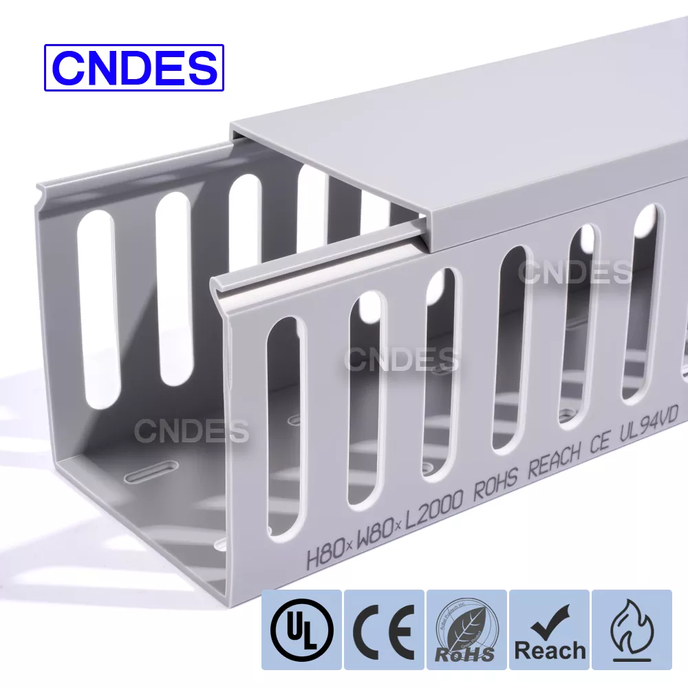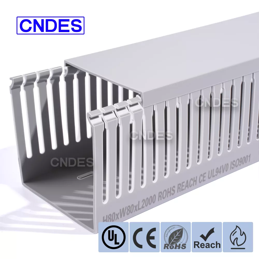 Wenn Standard-Kabelrinnen nicht in der Lage sind, komplexe Kabelbäume aufzunehmen, ist der CNDES kundenspezifische 80×80 geschlitzte PVC-Schalttafel-Verdrahtungskanal Ihre gute Wahl. Mit einem großen Innenraum von 80 mm x 80 mm ist es speziell für anspruchsvolle Szenarien wie die Backbone-Verkabelung von Rechenzentren, Stromcluster für Industrieanlagen und die zentrale Verkabelung in großen Schaltschränken konzipiert. Es nimmt problemlos eine große Anzahl von Kabeln auf und organisiert sie, sodass Unordnung und Stau ein für alle Mal Schluss machen.